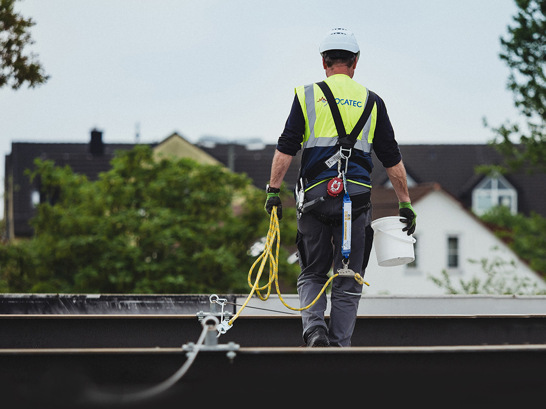 LOCATEC Mitarbeiter sichert sich auf einem Flachdach zur Leckortung von Undichtigkeiten.